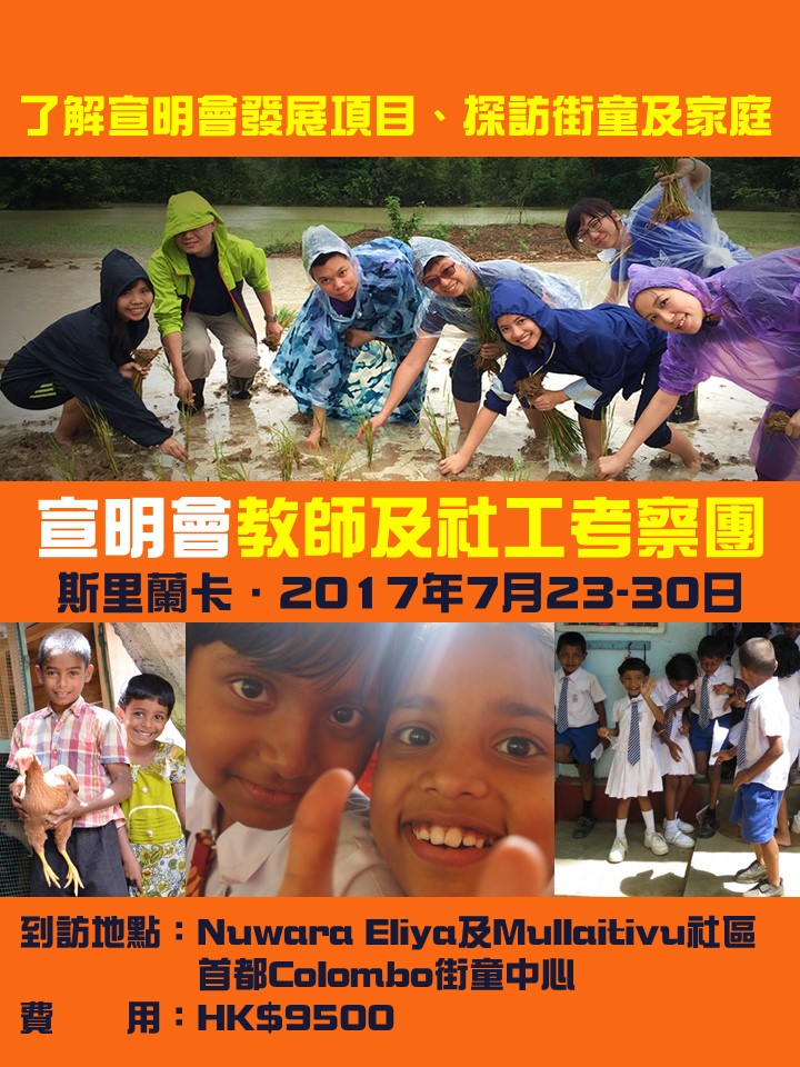 位於南亞的斯里蘭卡鄰近印度,是印度洋上的一個島國。該國曾經歷長達25年的內戰,並於2004年受到南亞海嘯重創。近年當地經濟發展漸有起色,但普遍鄉郊村民仍然缺乏清潔食水使用,社區的教育、衛生及醫療情況有待改善,而且欠缺基礎設施。當地不少貧困家庭的孩子為了生計,被迫成為童工,甚至街童。參加者將到訪Nuwara Eliya及Mullaitivu社區,及首都Colombo的街童中心。 活動重點: