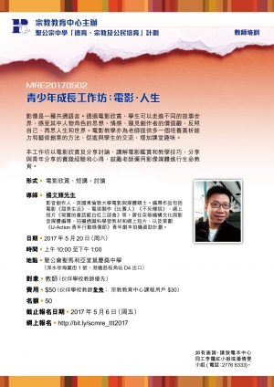 內容簡介 | 導師: 楊文輝先生 影音創作人,英國東倫敦大學電影與媒體碩士。編導作品包括電影《甜美生活》,電視製作《比賽人》《不死傳說》,網上短片《現實的童話藍白紅三部曲》等。曾任突破機構文化與影音媒體編導,拍攝通識科學習教材和網上短片,以及策劃《U-Action青年行動錄像節》青年劇本拍攝資助計劃。 形式: 電影欣賞、短講、討論 網上報名:http://bit.ly/scmre_ttt2017 如有查詢,請致電本中心同工李靄紅小姐或潘倩雯小姐 (電話:2776 6333)。